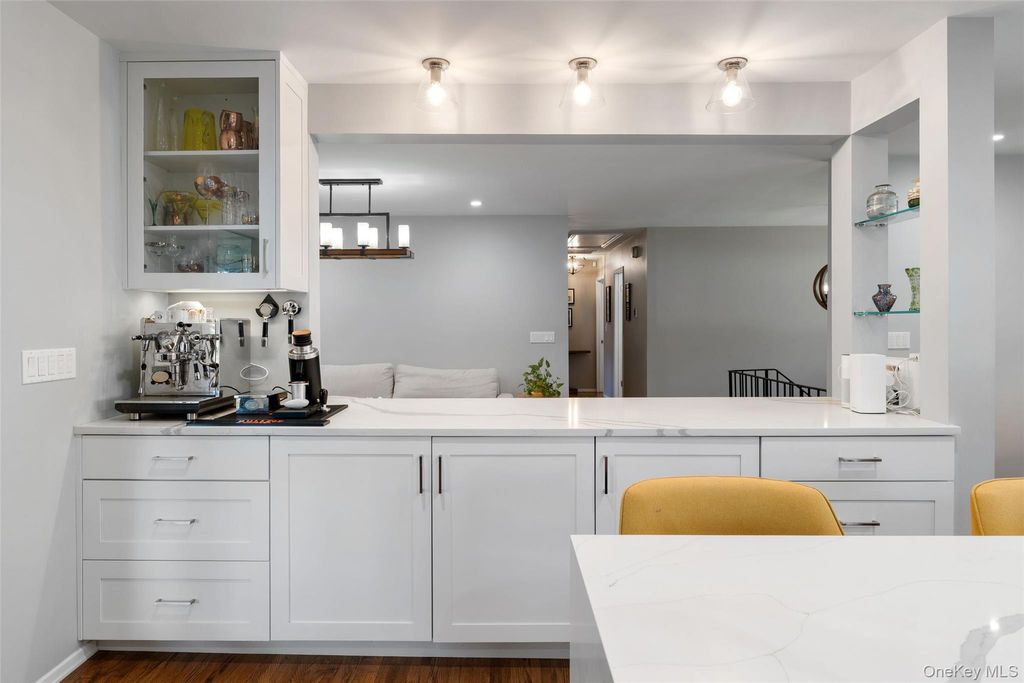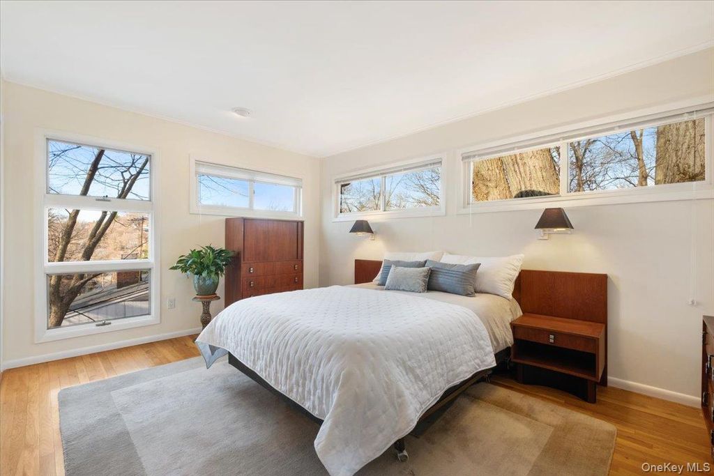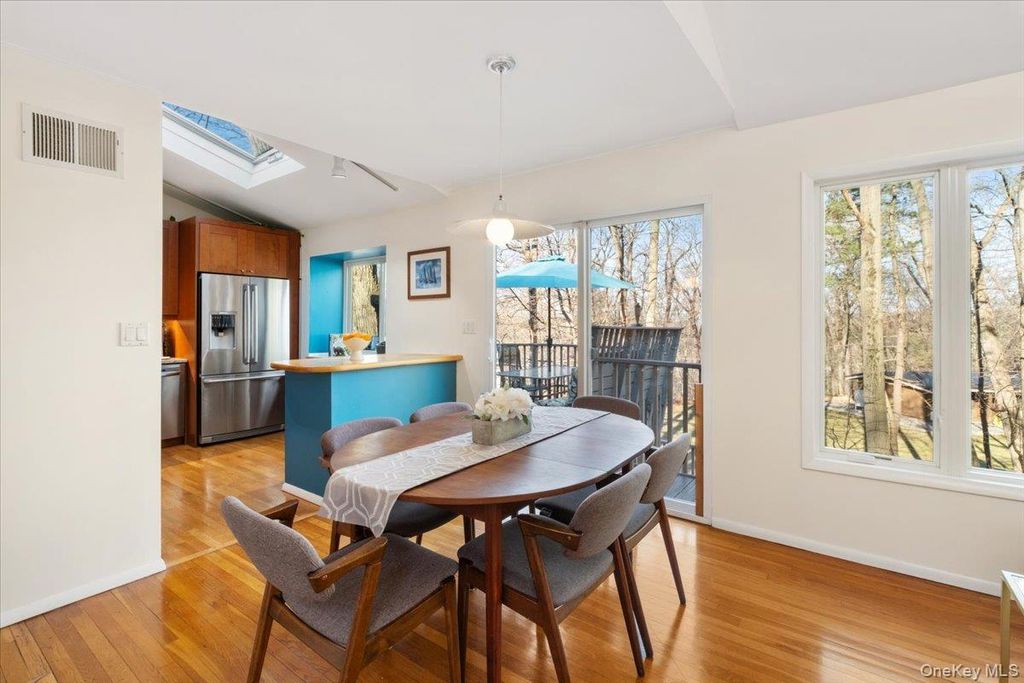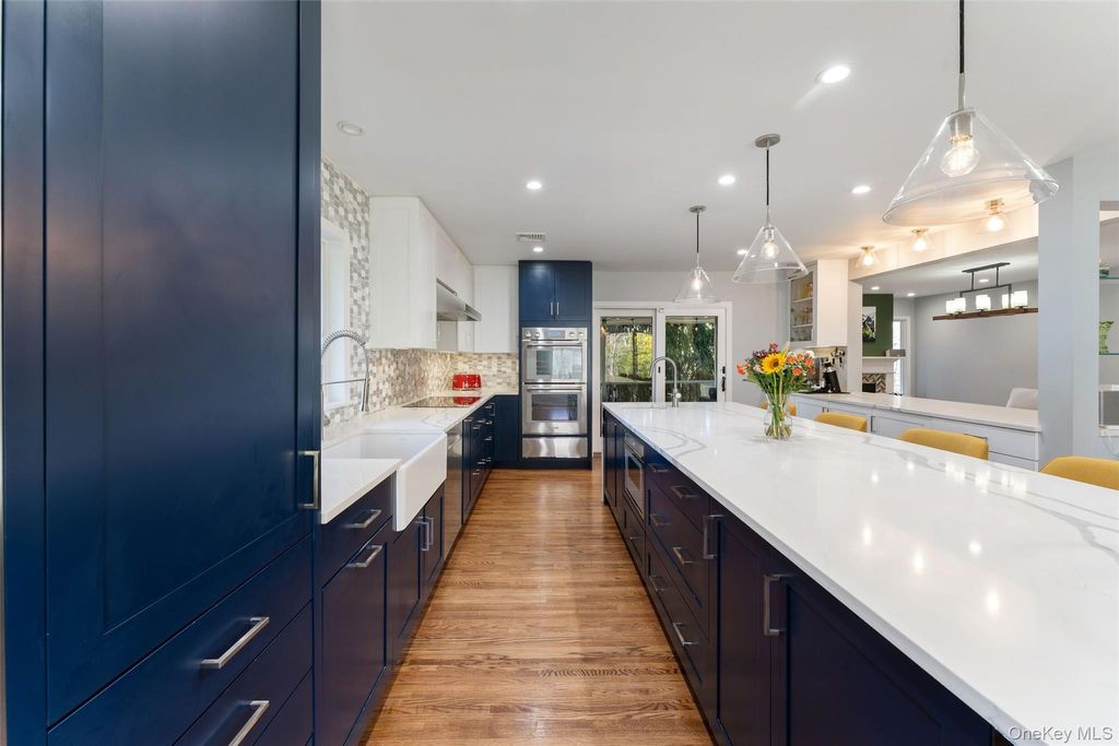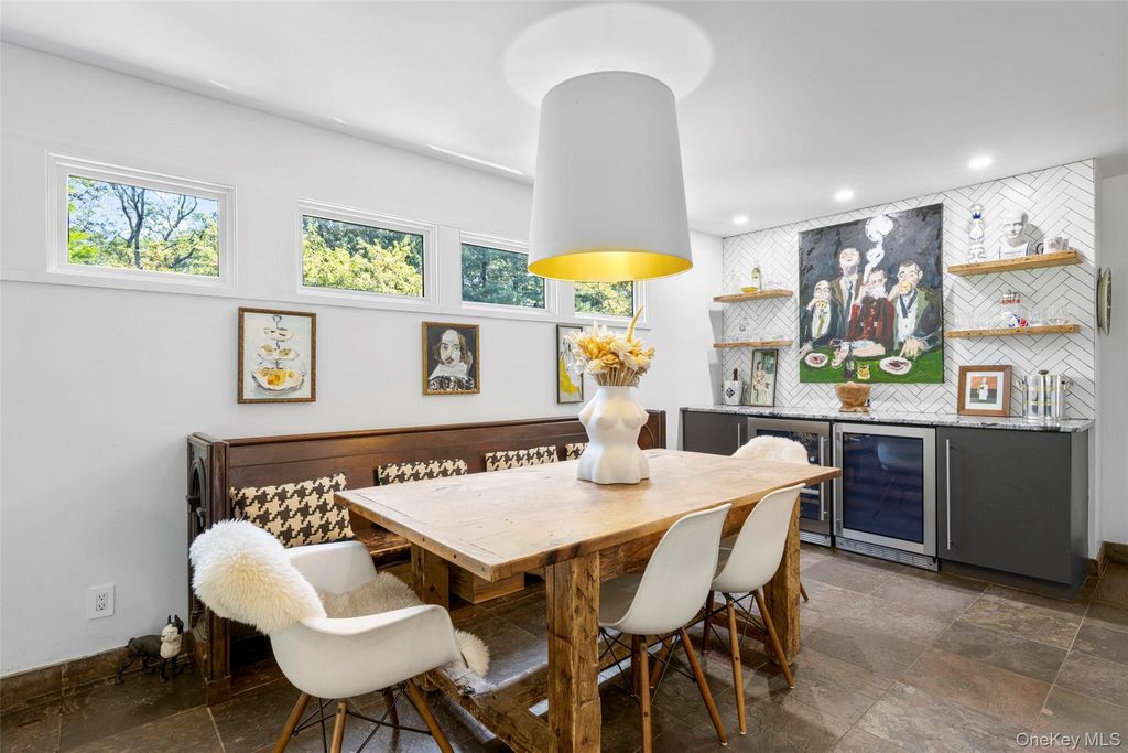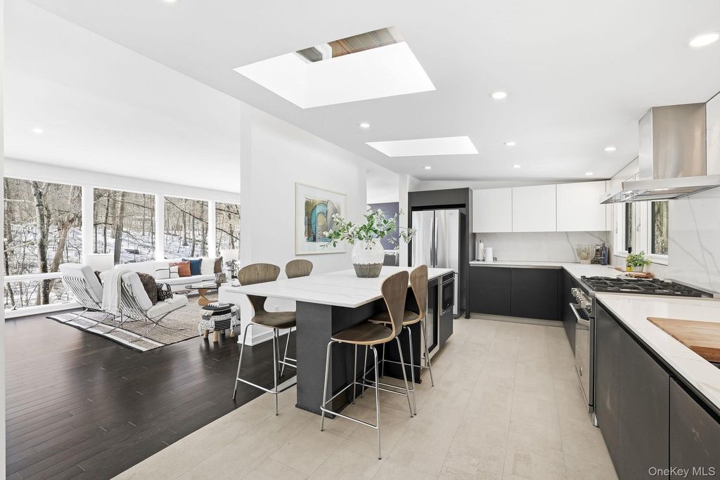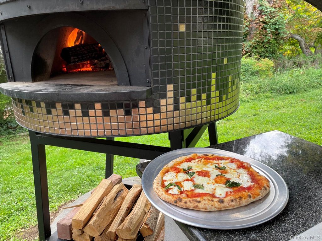 If your dream home includes a serious Michelin Star-level chef's kitchen, a professional outdoor pizza oven, and a lifestyle where the car becomes optional, 7 Dogwood Lane in the picturesque village of Irvington may feel like it was designed for you. Set on a peaceful cul-de-sac in one of Irvington's most coveted walk-to-all neighborhoods in the highly rated Irvington School District, this striking mid-century raised ranch with standout architectural curb appeal blends modern luxury, flexible living space, and effortless everyday convenience. Just moments from the award-winning schools, Metro-North service to Manhattan, the farmers market, acclaimed restaurants, boutique shops, parks, and the scenic Old Croton Aqueduct trail, the lifestyle here offers the rare balance of village charm and city accessibility. Designed for serious cooks and those who love to entertain, the heart of the home is the show-stopping designer kitchen created by a renowned local architect and premiere local contractor. This true chef's kitchen features top-of-the-line Thermador appliances including a double steam oven, induction cooktop, and impressive 60" refrigerator/freezer. Luxury details include a built-in filtered seltzer system, dedicated espresso water line, sleek quartz countertops, and a dramatic 12-foot waterfall quartz island with integrated lighting and double-sided storage, an exceptional space for both everyday cooking and large scale entertaining. Just off the kitchen, the covered deck offers the perfect setting for evening cocktails under the stars. Additional upgrades include a New Roof (March 2026), Restoration Hardware designer lighting, new 4" LED high-hat lighting throughout, and an energy-efficient heat pump system (2025), making the home fully electric. This stunning 5-bedroom home (lives like 6) with 3 full baths offers an ideal layout for today's lifestyle. The upper level features four spacious bedrooms including an ensuite primary plus a hall bath, while the lower level provides exceptional flexibility with a separate wing featuring two additional bedrooms, one with a walk-in closet, and a third updated full bath, perfect for guests, Au Pairs, remote work, or extended living, and a large family room with sliding doors opening to the patio. Two wood-burning fireplaces (one in main living space adjacent to the kitchen, and one in lower level family room) add warmth and character, creating inviting spaces for both quiet evenings and lively gatherings. Step outside the family room, and the entertaining continues outdoors with a professional $10,000 wood-burning pizza oven, creating the ultimate backyard setting for alfresco dinners, weekend hosting, and memorable evenings under the stars. With its versatile layout, designer kitchen, serious entertaining amenities, and rare walk-everywhere Irvington location with seamless Manhattan access (45 minutes into GC), this is Rivertowns living at its most compelling.