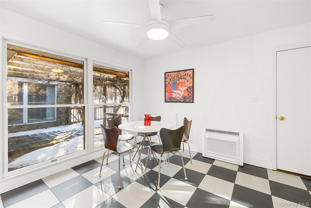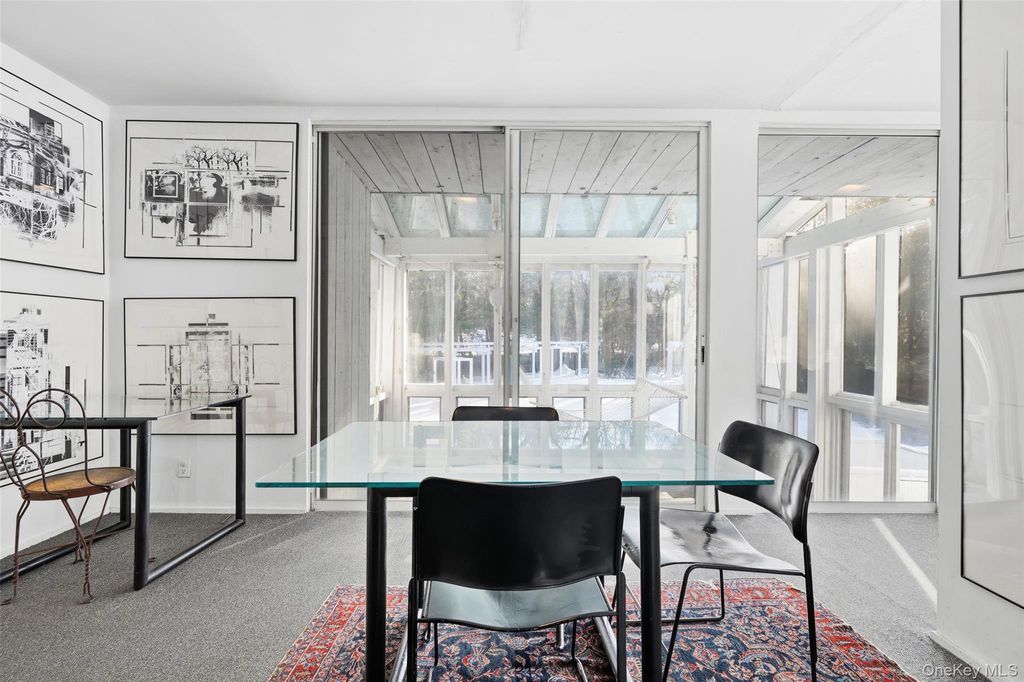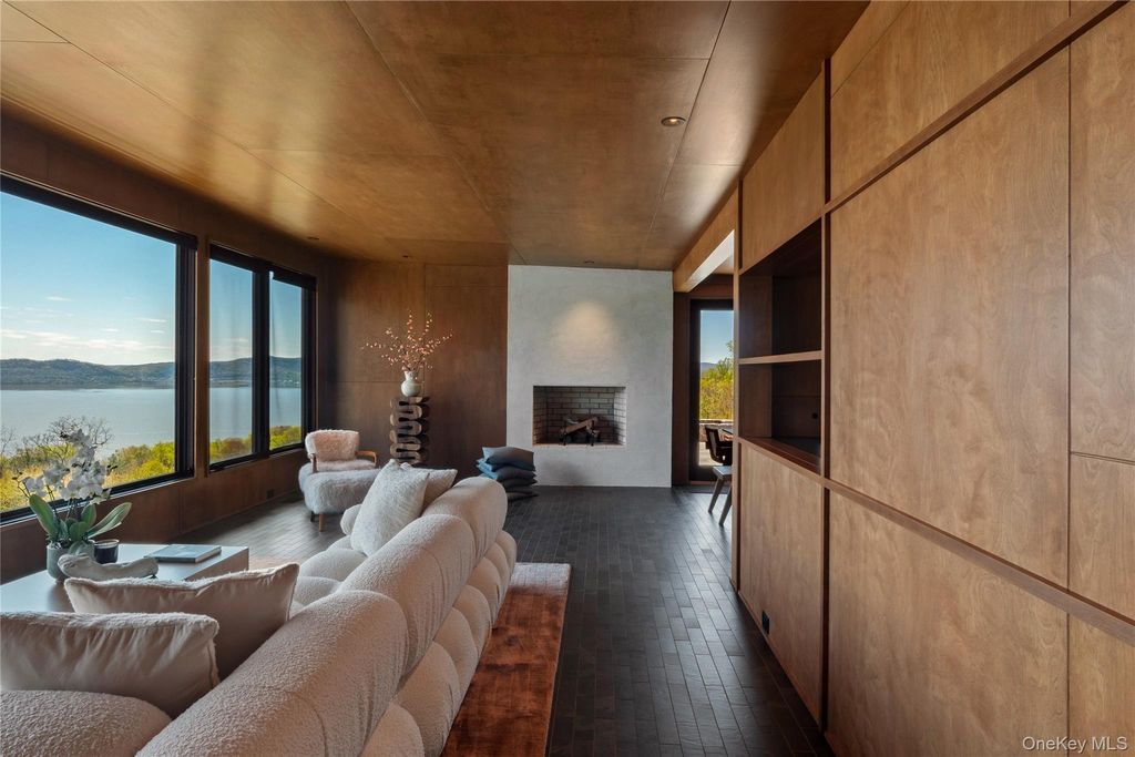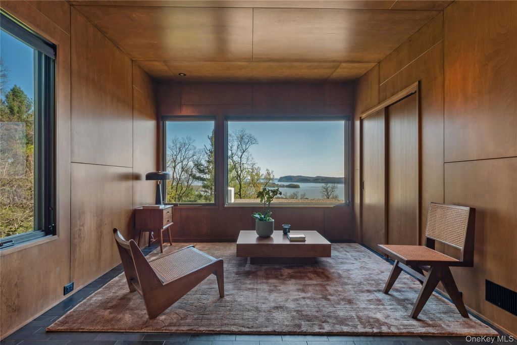 The Volner House is a mid-century modern residence with Hudson River views, located approximately 45 minutes from New York City and indirectly adjacent to the Hudson National Golf Course. The property overlooks multiple river bays and offers southern and western exposures with sunset views. Designed in 1951 by modernist architect H. Seymour Howard Jr., a graduate of Harvard University's Graduate School of Design, the home reflects the principles of early postwar modern architecture. The main residence has been restored with careful attention to original materials and proportions. A separate pool and guest house, along with a three-car bermed garage, was added as part of the restoration. Interior features include birch paneling and custom built-in cabinetry throughout. Kitchens, bathrooms, and climate control systems have been fully updated with contemporary fixtures, energy-efficient infrastructure, and integrated Crestron smart home controls.