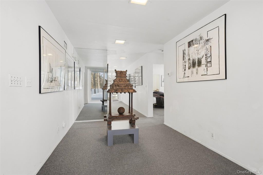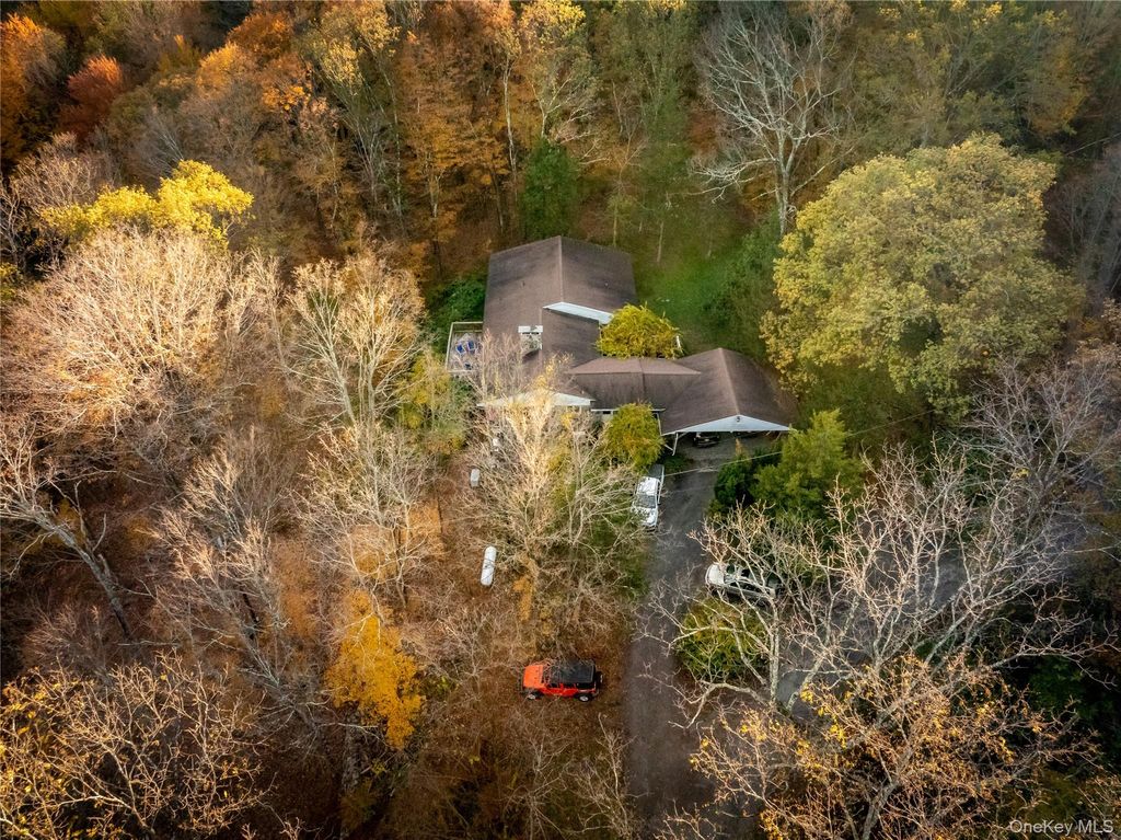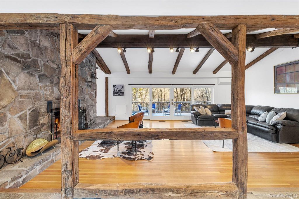 Spacious, secluded and close to New Paltz: This roomy ranch features key technical updates while retaining its bright 1970s vibe. Privately set at the end of a long driveway flanked on each side by stacked-bluestone walls, the house sits at the center of the historic Stonewall Farm on its own 19 wooded acres. Entered through a pergola-topped courtyard into a symmetrical blue-stoned foyer gallery, the 3-bedroom, 2-bath ranch immediately opens to a dramatic sunken living room with vaulted beamed ceilings and a stunning stone fireplace, with a full wall of sliding-glass doors offering panoramic views of the woods and a ravine. The vibe is bright and airy but also remarkably vintage, including the oversized kitchen with cheery orange cabinets. Each bedroom is spacious, and there's a finished family room in the walk-out basement level. Recent upgrades include a whole-house Generac generator and a ductless central-air and heating system, both installed in 2015. A remarkably unspoiled vintage gem, the house is minutes by car or bicycle from the Walkway Over the Hudson, MetroNorth and Amtrak train service in Poughkeepsie, and the charms of New Paltz, one of the Hudson Valley's most popular college towns.