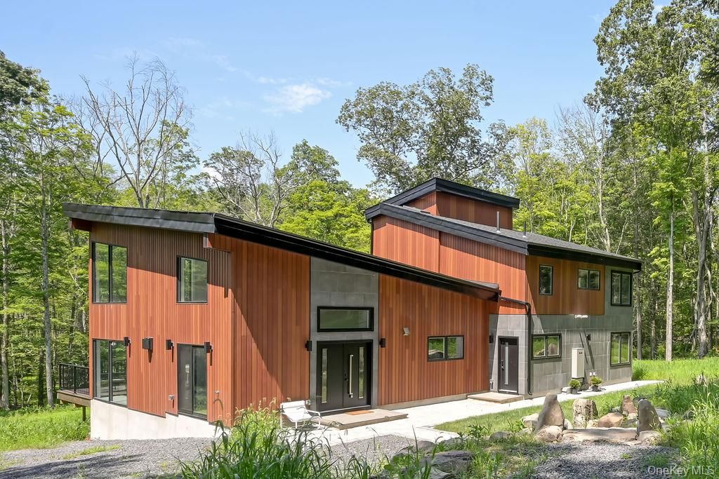 This contemporary mountain home designed by Mapos Architects offers sophisticated living in perfect harmony with its natural surroundings. Thoughtfully divided into three distinct sections to preserve the landscape's integrity, this 3,400 square foot residence provides both luxury and connection to nature. The main living area features warm cedar cladding and a distinctive green roof deck that extends the natural landscape. Floor-to-ceiling triple-pane sliding glass doors open completely to transform the space into a seamless indoor-outdoor environment, perfect for entertaining or peaceful relaxation. The bedroom wing extends dramatically outward from the slope, creating a floating effect above the landscape. The primary suite includes a private, deck with unobstructed mountain views, while three additional bedrooms, each offer their own bath and tranquil setting. A separate guest wing, constructed of poured concrete that echoes the surrounding stone terrain, provides privacy for visitors and includes its own elevated roof deck with panoramic vistas. Built with premium sustainable materials and meticulous attention to detail, Slide Mountain House represents exceptional mountain living with modern comforts. This property balances architectural significance with practical luxury"”an investment in both lifestyle and legacy in one of the Catskills' most desirable locations.