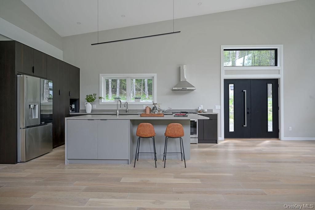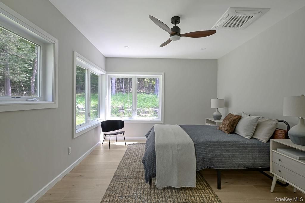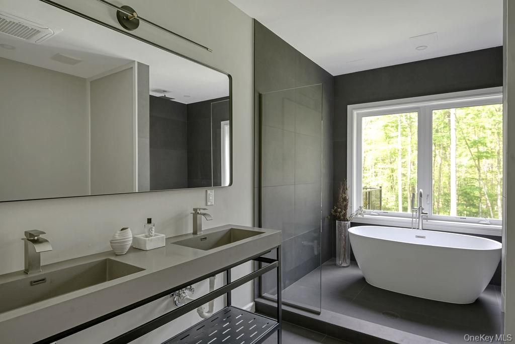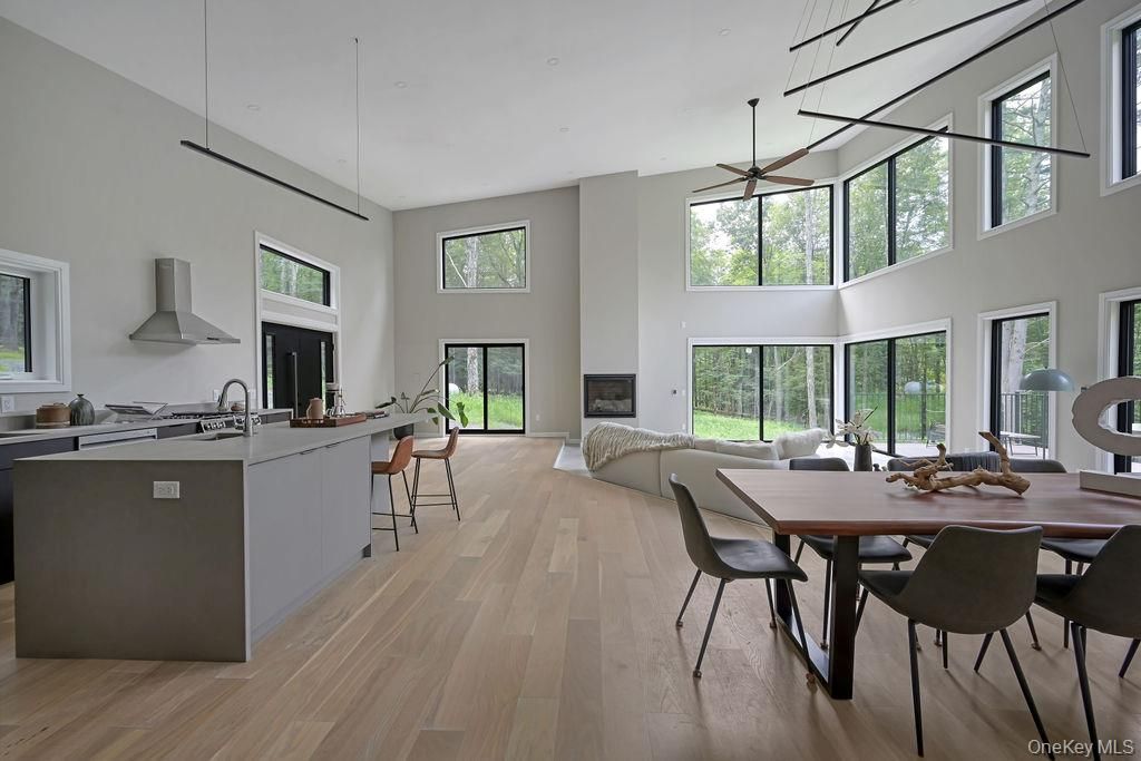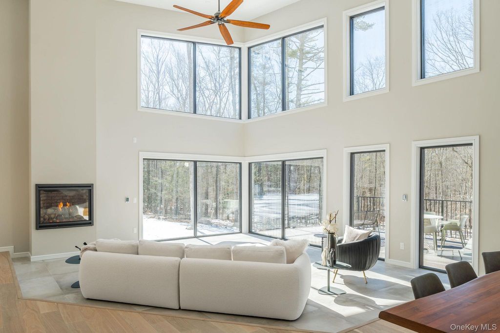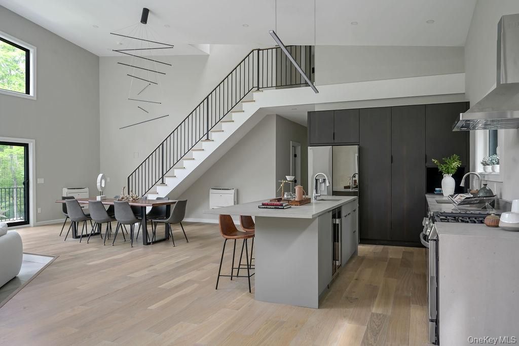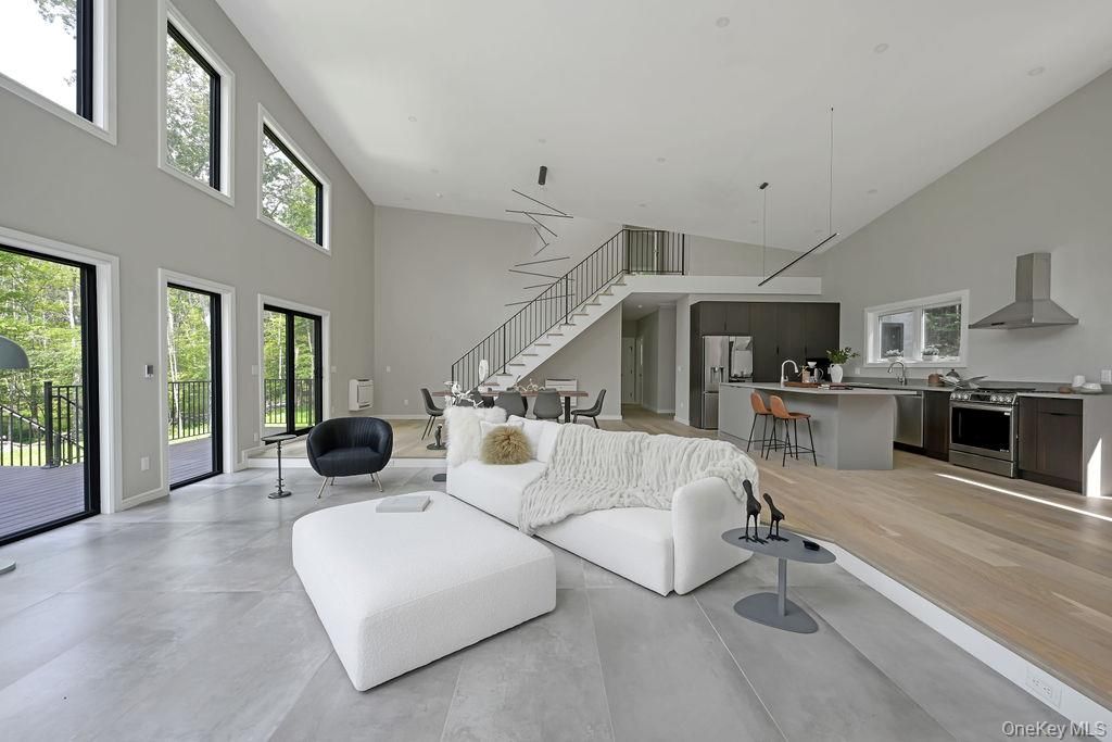 Welcome to Ashokan Forest Haven, a one-of-a-kind escape located between the heart of Stone Ridge and the Ashokan Reservoir. Constructed in 2024, the Haven is composed of clean lines, carefully considered finishes, and an ecological ethos creating a backdrop for adventurous, effortless living harmonized with its forest surroundings. This property can cater to a variety of lifestyles, whether you're envisioning this as your primary residence, an active vacation getaway, or a savvy investment. Situated on 7 private acres, the flawless craftsmanship and attention to detail values clean spaces, eco-friendly attributes and a clutter-free environment, rooted in minimalist principles for mental and physical well-being. The living area boasts double-height ceilings creating a bright and airy ambiance, while two stunning walls of windows seamlessly connect you to the woods. The sunken living area has radiant heat and a fireplace, perfect for warm gatherings on chilly evenings. The open kitchen features sleek rift cut oak cabinets with a rich shou shugi ban finish, quartz countertops, an island with prep sink, beverage refrigerator and a full suite of high end appliances. Wide plank white oak floors are a stylish choice and the multiple pitch shed rooflines create dramatic architectural angles in each room. The primary bedroom suite has an adjoining flex space that can be a walk-in closet or home office, as well as a lofted area with windows and skylights that impart a delightful tree house feel, perfect for yoga, contemplation or artistic pursuits. The two full baths are Korean in style, each has a wet room that contains both the soaking tub and rain shower for everyday luxury, with windows that overlook the private forest. The home's energy-efficient HVAC electric heat pump system, paired with meticulous insulation, ensures comfort year-round with minimal environmental impact. Every aspect, inside and out, is coherently designed for warm beauty and easy care, using the highest quality materials. The exterior is clad in MAC architectural steel designed to be maintenance-free for years to come. The Trex deck and hot tub are surrounded by breathtaking wooded views and meandering stone walls. Location: It is 5 minutes to the Ashokan reservoir, perfect for a stroll or bike ride. Just minutes from Woodstock/Kingston/Stone Ridge and a mere 2-hour drive from NYC, you'll have easy access to the restaurants, shops, activities and skiing that make this area so special. Embrace the turn-key convenience of this exceptional residence and enjoy the best of upstate living.